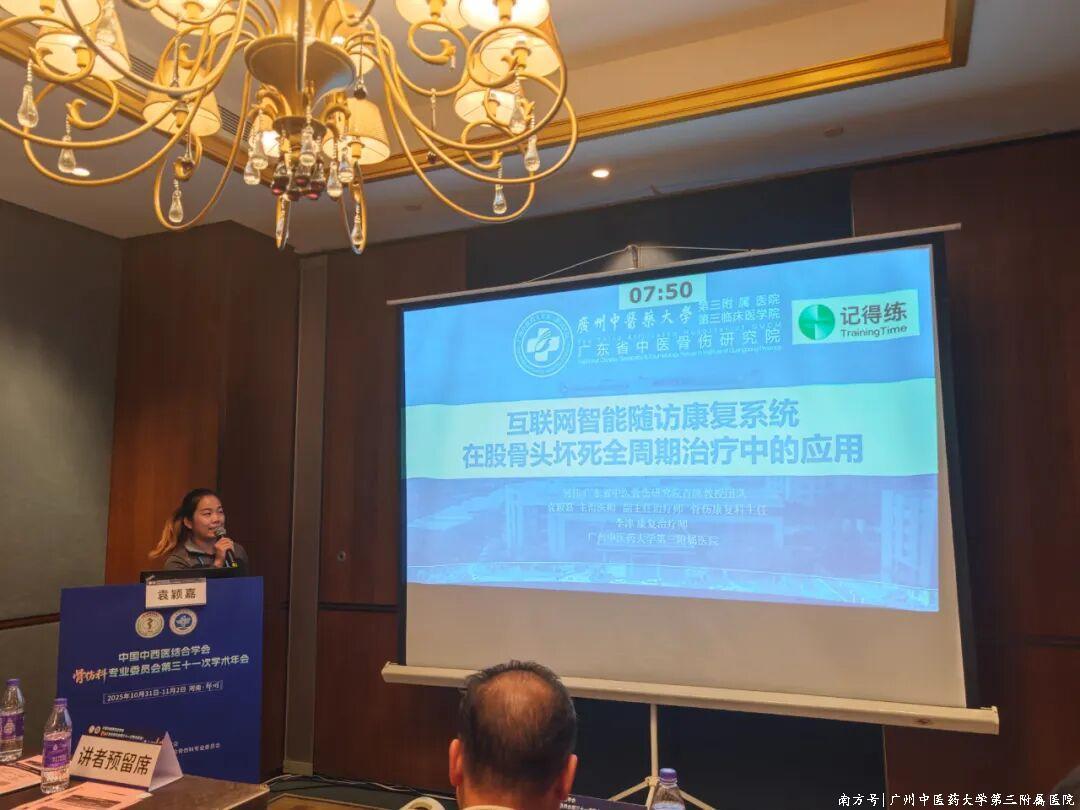骨伤康复科袁颖嘉主任(李津康复治疗师代替出席)在关节/骨坏死学组分会进行新技术分享,以《互联网智能随访康复系统在股骨头坏死全周期治疗中的应用》为题介绍了我院骨伤康复科自主研发的“记得练”运动训练计时器小程序和股骨头坏死随访系统,为股骨头坏死全周期长期的病程跟踪提供更高效、完善的随访工具。