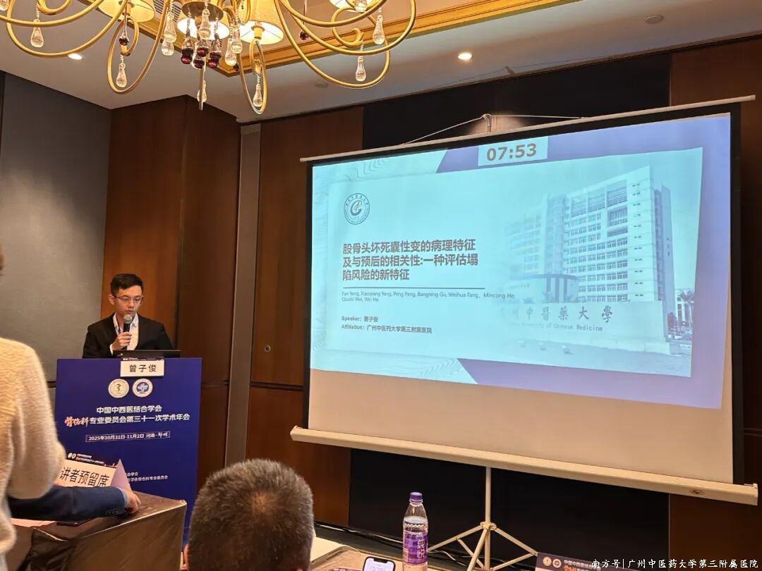 关节科硕士研究生曾子俊在骨坏死专场以《股骨头坏死囊性变的病理特征及与预后的相关性》为主题作学术汇报。研究揭示,股骨头坏死中的囊性变与塌陷风险显著相关,尤其前外侧病灶风险更高。病理分析显示,囊性变内同时存在骨破坏与修复活动,为保髋治疗提供新思路。