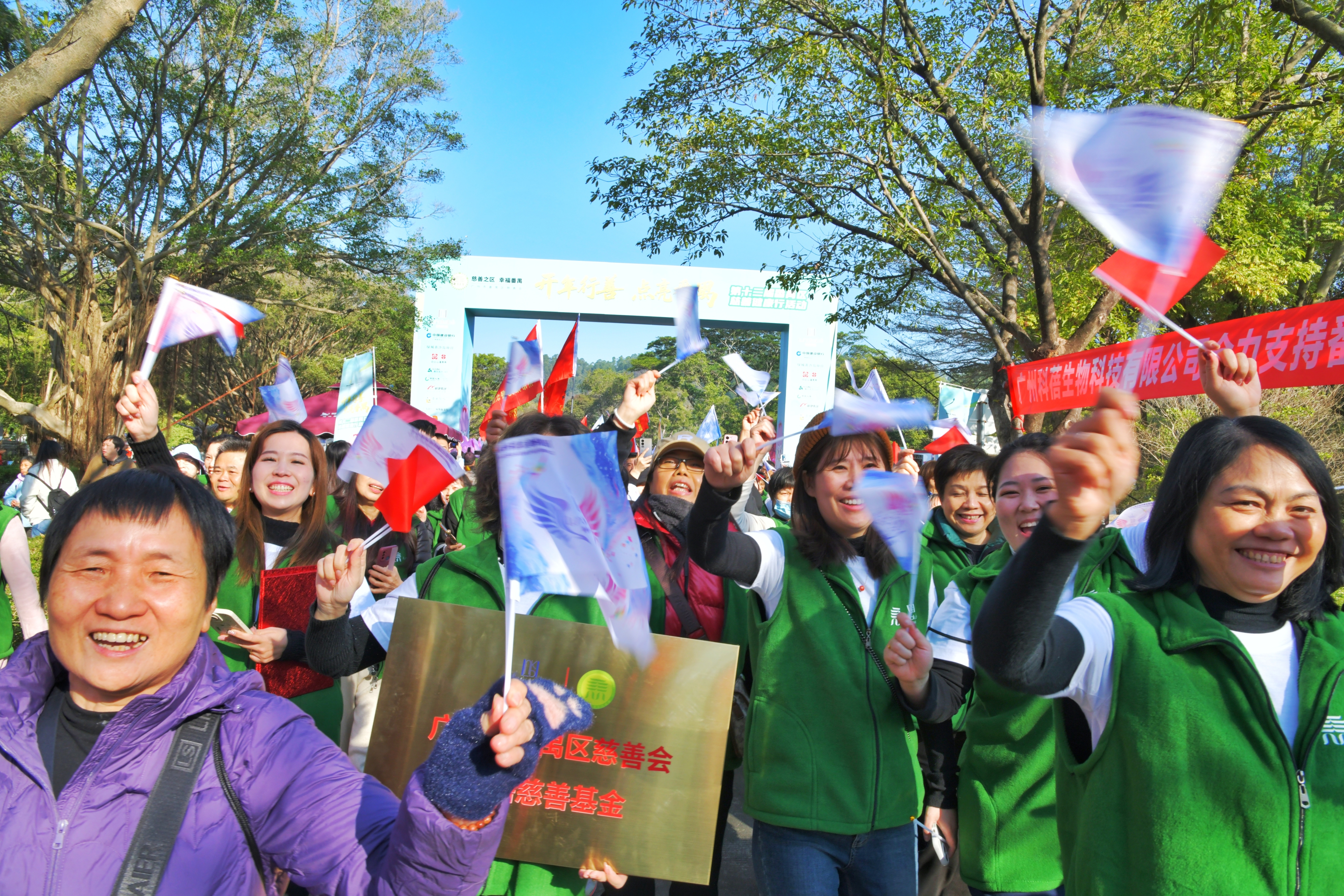 随着发令枪响,参与群众沿5公里生态步道有序徒步,途经南游艇码头、十二生肖广场、七盏灯广场三处打卡点,在漫步湖光山色之间,进一步了解番禺慈善事业,以行走传递爱心。