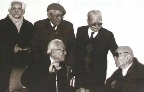 刘海粟(前右)与谢海燕(前左)、吴芳谷(后右)、陈大羽(后中)、刘昌潮(后左)在元宵画会